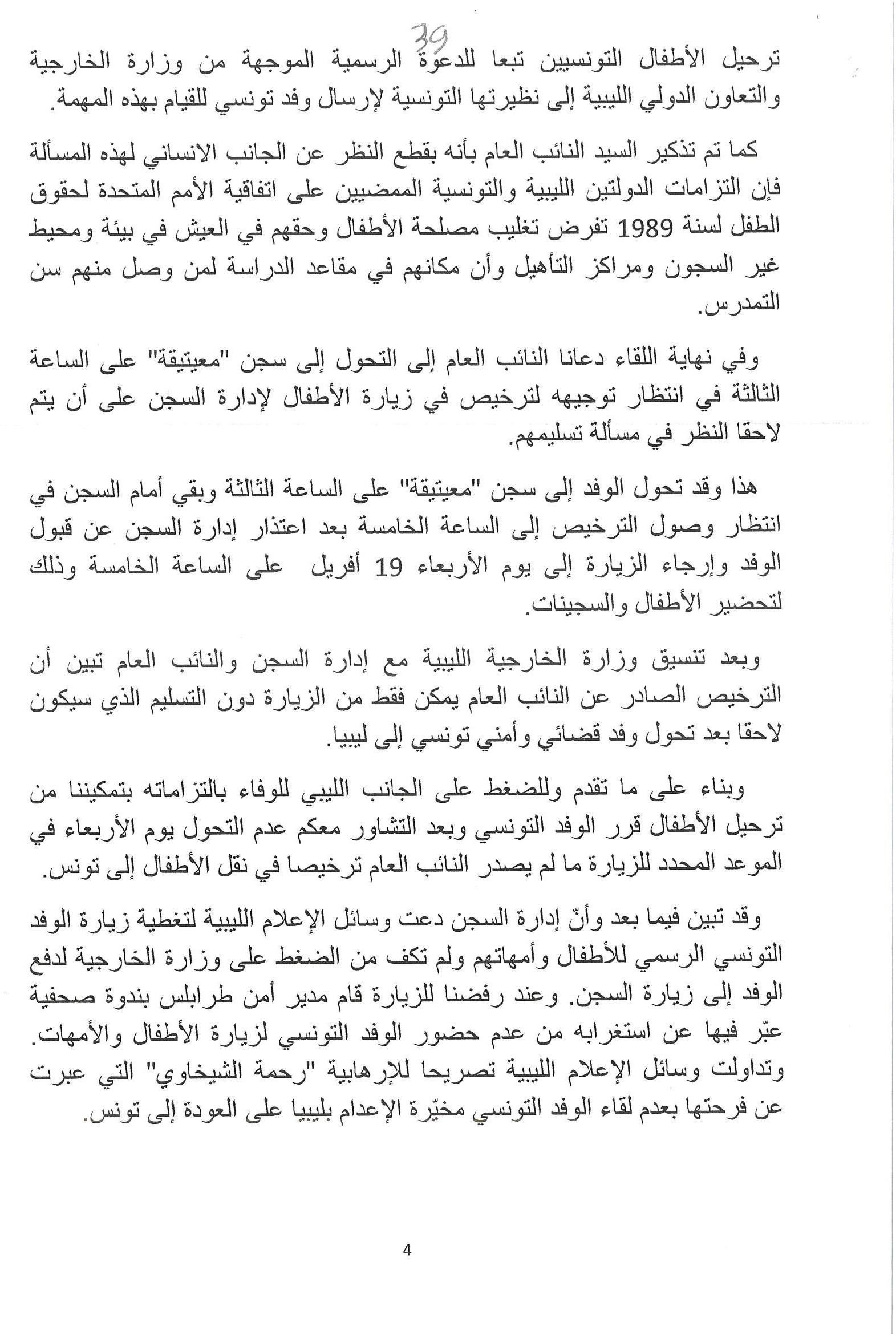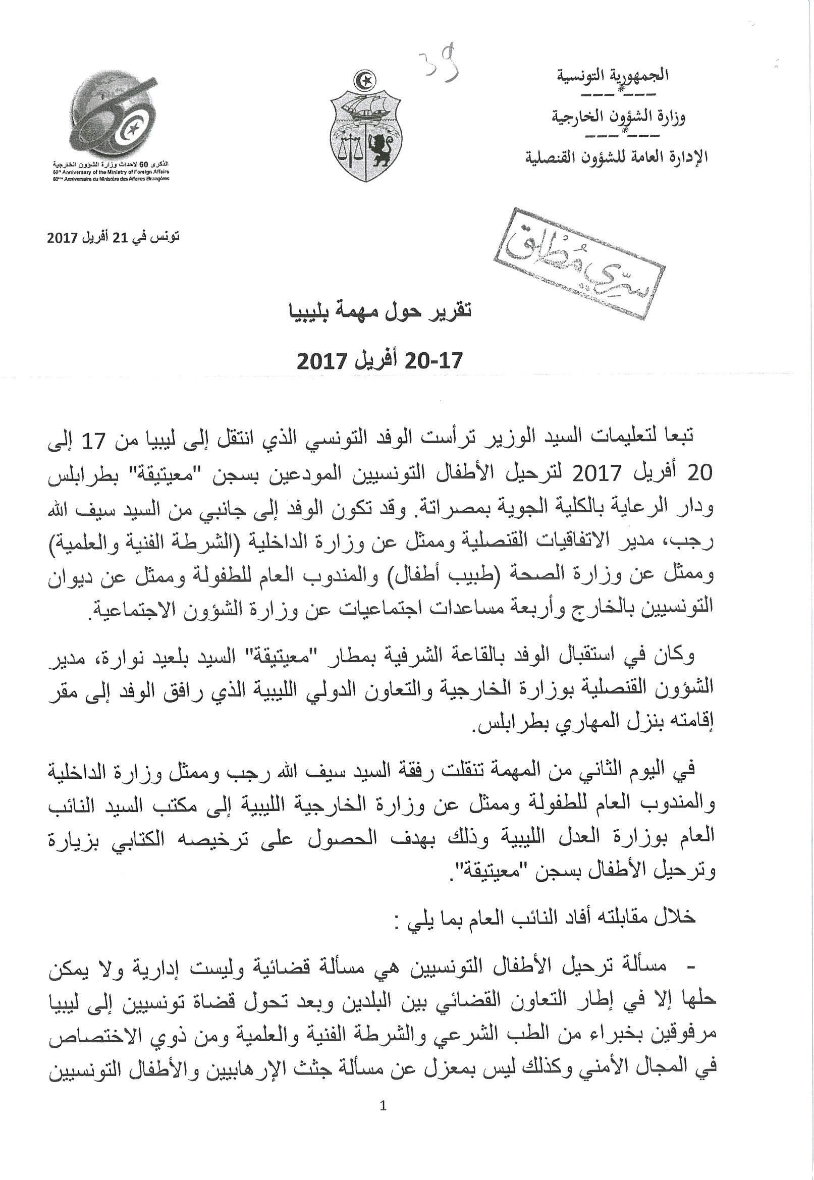 La mission a duré du 17 au 20 avril 2017. La rencontre avec le vice-ministre général de la justice libyenne, le deuxième jour, révèle d’emblée, un désaccord entre les parties tunisienne et libyenne sur ce qui est désormais appelé le« dossier des enfants ». Celui-ci touche, en fait, des volets sécuritaire, judiciaire, politique et technique qui nécessitaient une coopération entre les parties Libyenne et Tunisienne. Coopération avortée.